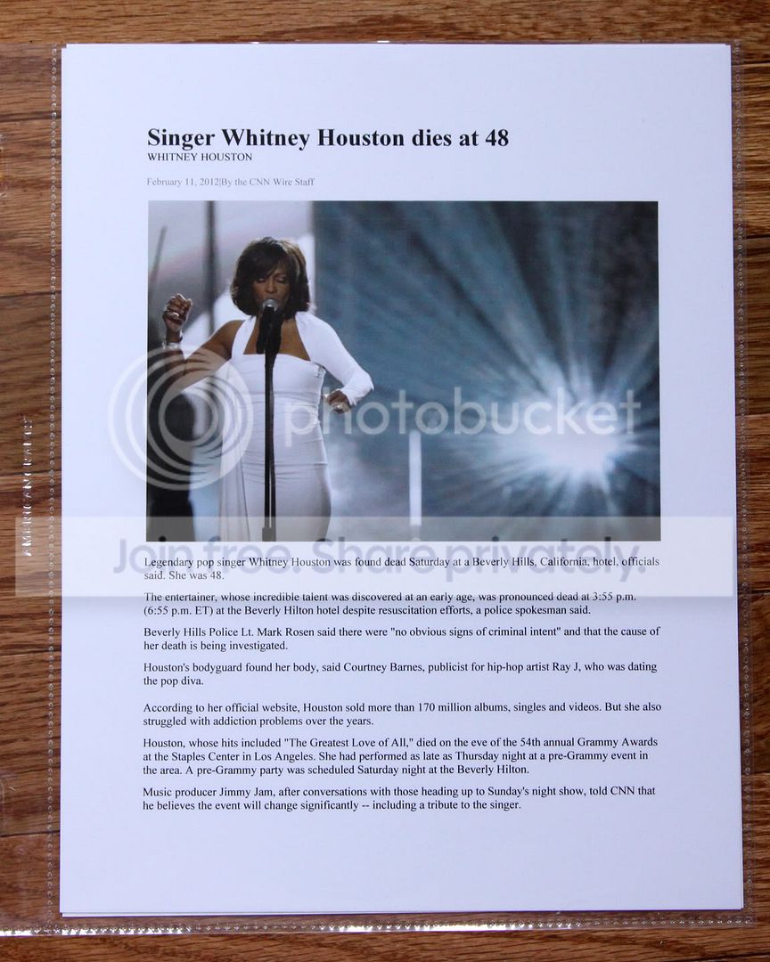 And then the tragic news of Whitney Houston....I simply printed a news ad from the internet and popped it in a page protector. I knew I wanted to keep the story since she was a huge star in my era ( I remember when she started!). But I didn't want to spend a lot of time on it either so this worked perfect!