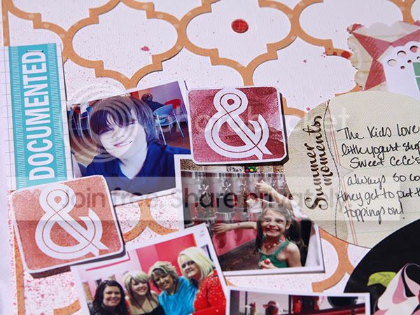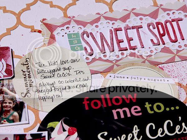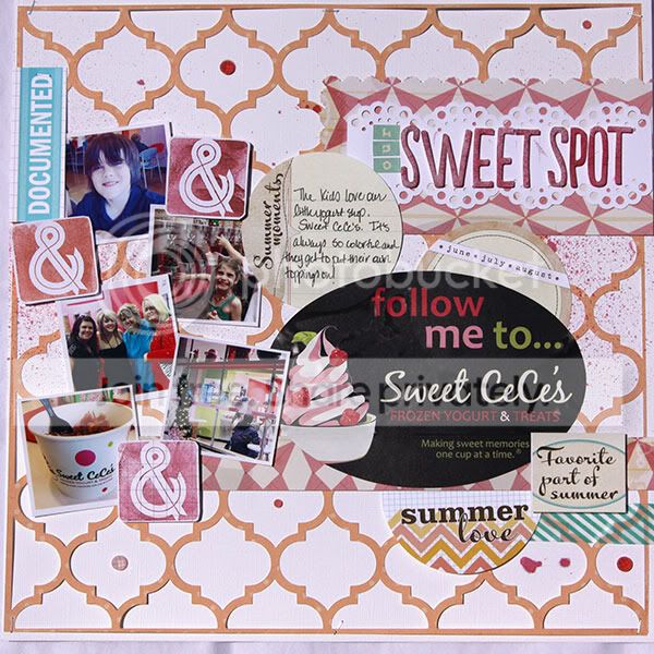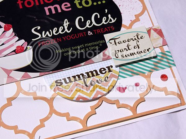 The challenge was to use an everyday, found object or item on your layout. I used a sticker from our favorite local yogurt shop. I cut the background on my Cameo (loving that thing!) and then just added some Elle's Studio tags.